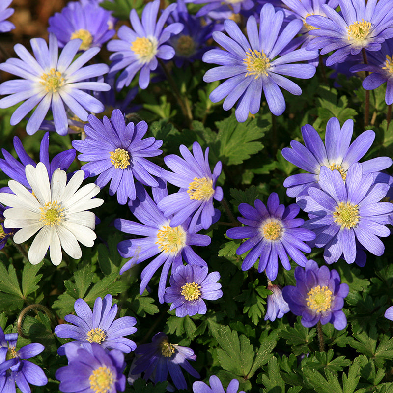 Anemone blanda 'Blue Shades' bietet im Frühling einen Teppich mit Hunderten von kleinen, sternförmigen Blüten in verschiedenen Blautönen. Das Balkan-Windröschen bietet wechselnde Farben von Himmelblau bis Tiefblau mit einem gelben Herzen als Kontrast.