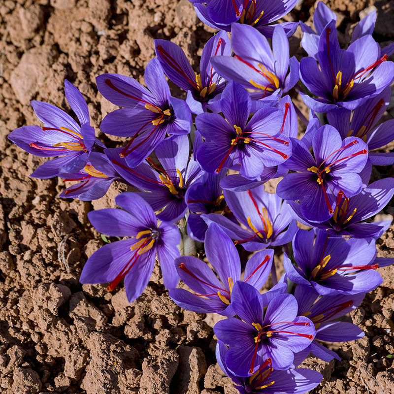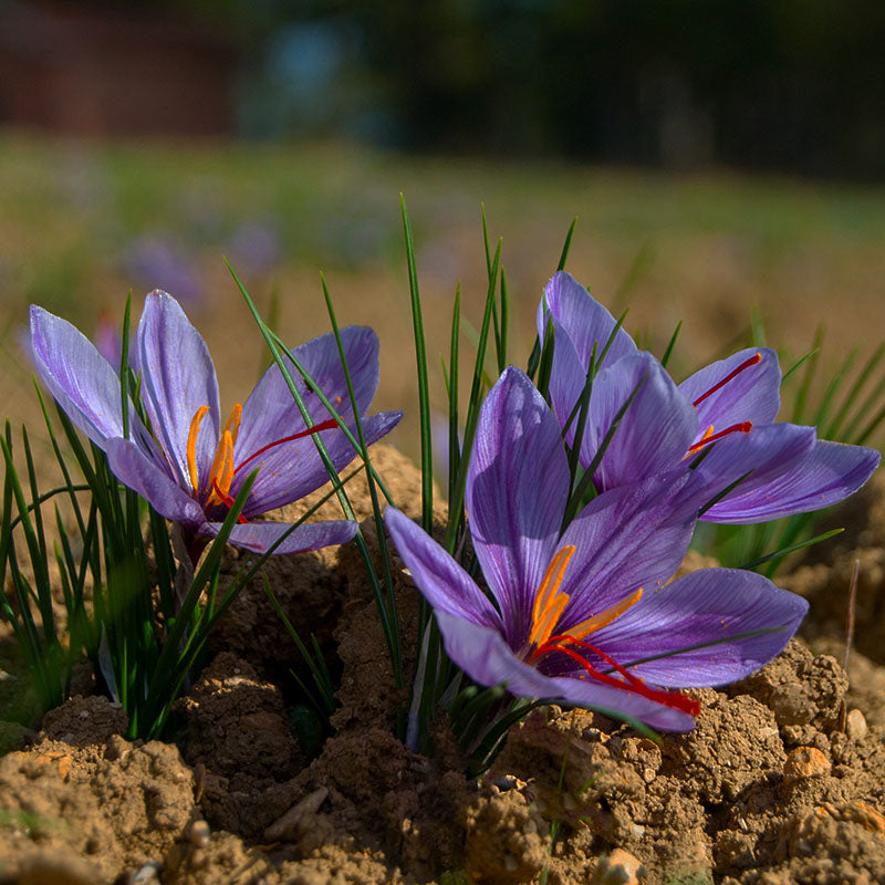 Crocus sativus, besser bekannt als Safrankrokus, ist eine kostbare Zwiebelpflanze mit wunderschönen, tiefvioletten Blüten im Herbst und Staubgefäßen, die aufgrund des Safrangehalts auch als „Rotes Gold“ bezeichnet werden. Ab 3 Stück: 5,40 € pro Packung.