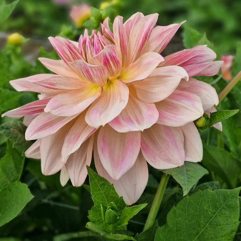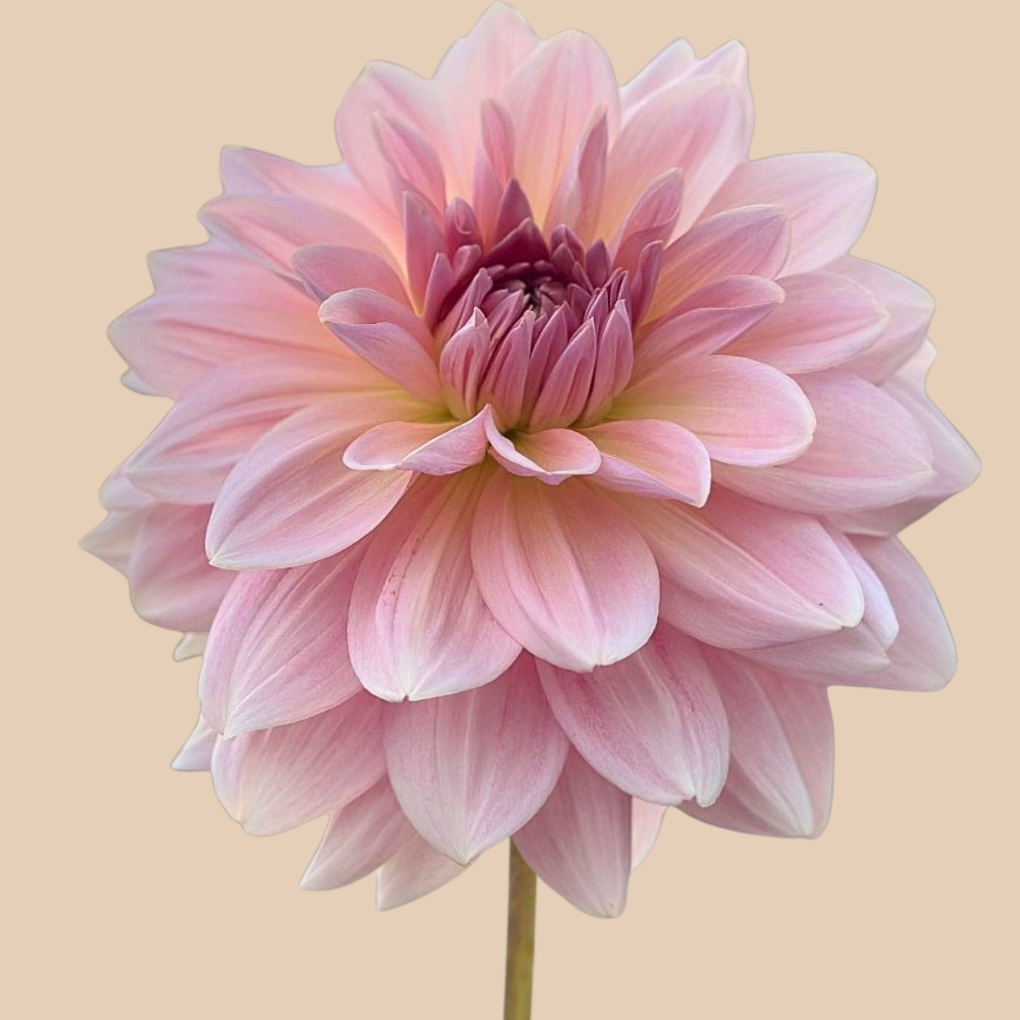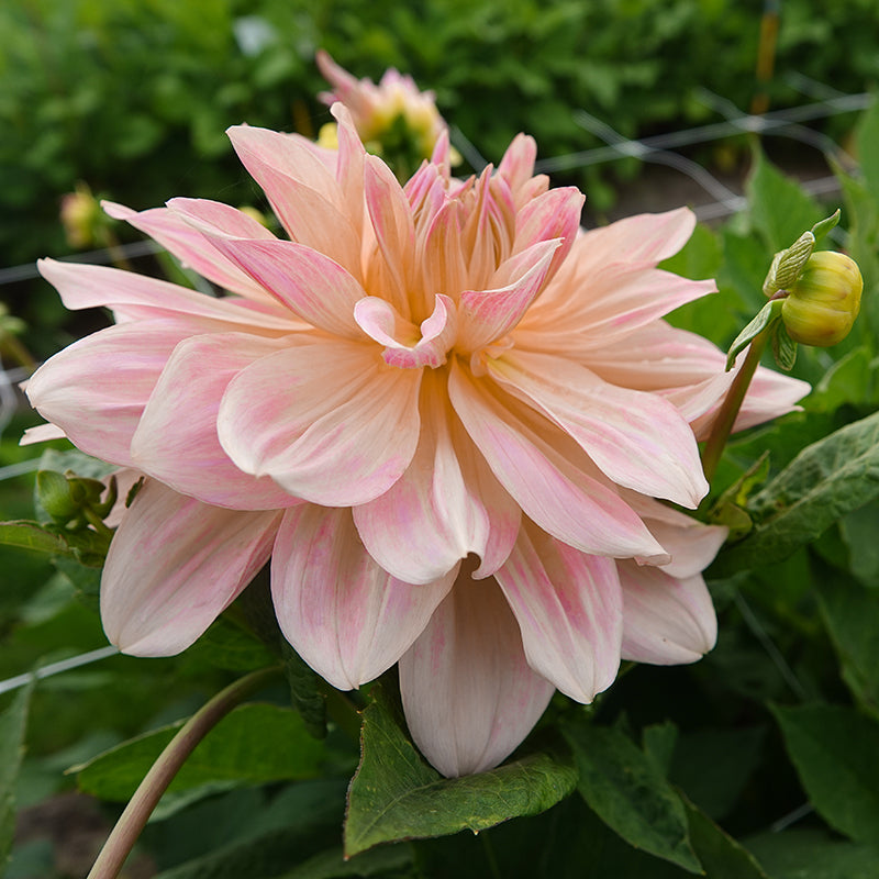 Die Dahlie ‘Fairway Pilot’ ist eine Dahlie, die man nicht einfach übersehen kann. Ihre Blüten können bis zu 25 cm groß werden und haben eine zarte lachsrosa Farbe mit subtilen Korallentönen. Die Blütenform ist offen und voll, sie stehen schön nach oben gerichtet, fast wie Seerosen. Perfekt für alle, die große Blüten mit einer zarten, romantischen Ausstrahlung lieben.