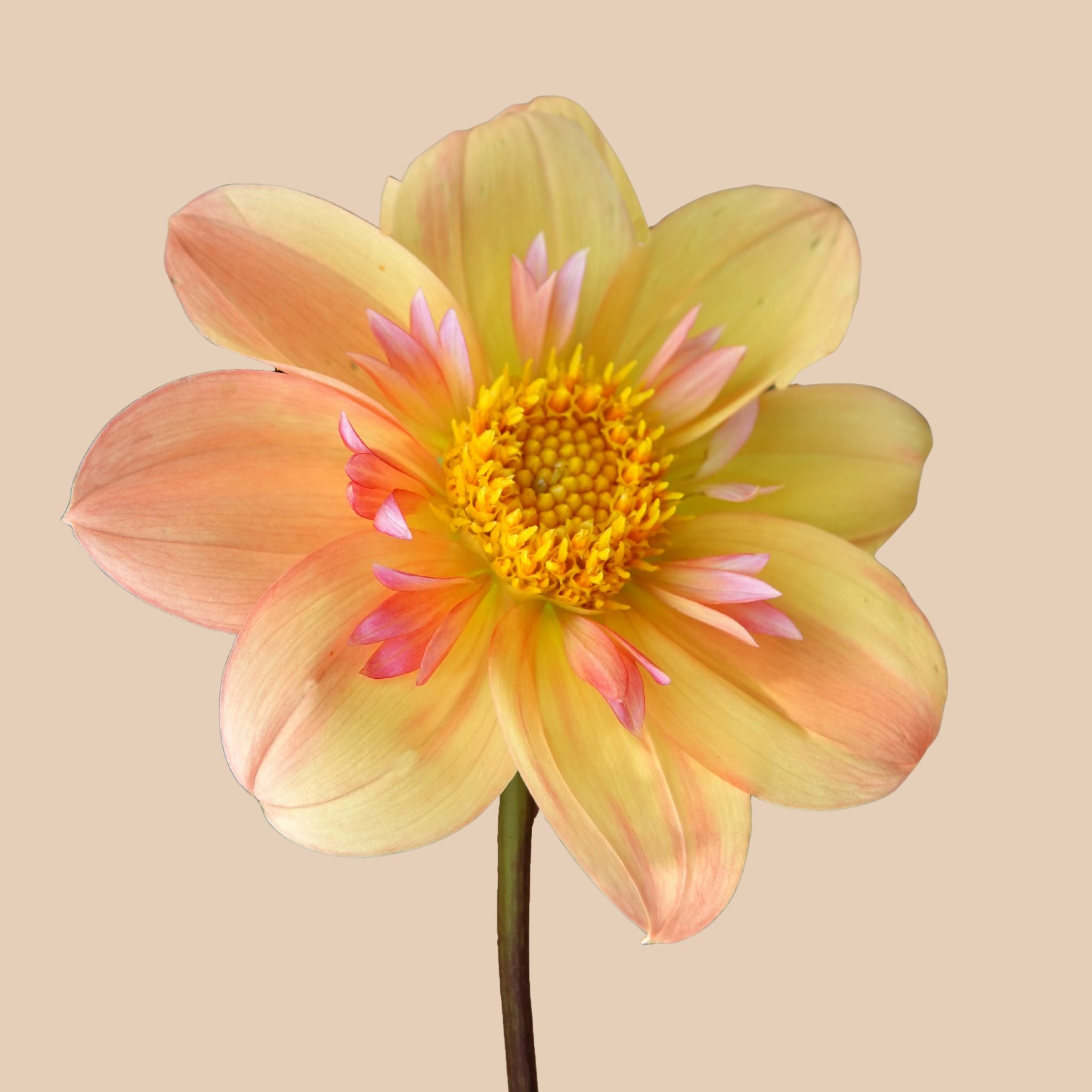 Die Dahlie ‘Kelsey Annie Joy’ ist eine sonnige und lebendige Bereicherung für dich und die Natur. Ihre einfach blühenden Blüten sind etwa 10 cm groß und haben eine warme Farbpalette aus zartem Pfirsich und Gelb, hier und da mit einem Hauch von Rosa. In der Mitte glänzt eine Krone voller Nektar, die Bienen und Schmetterlinge anzieht.