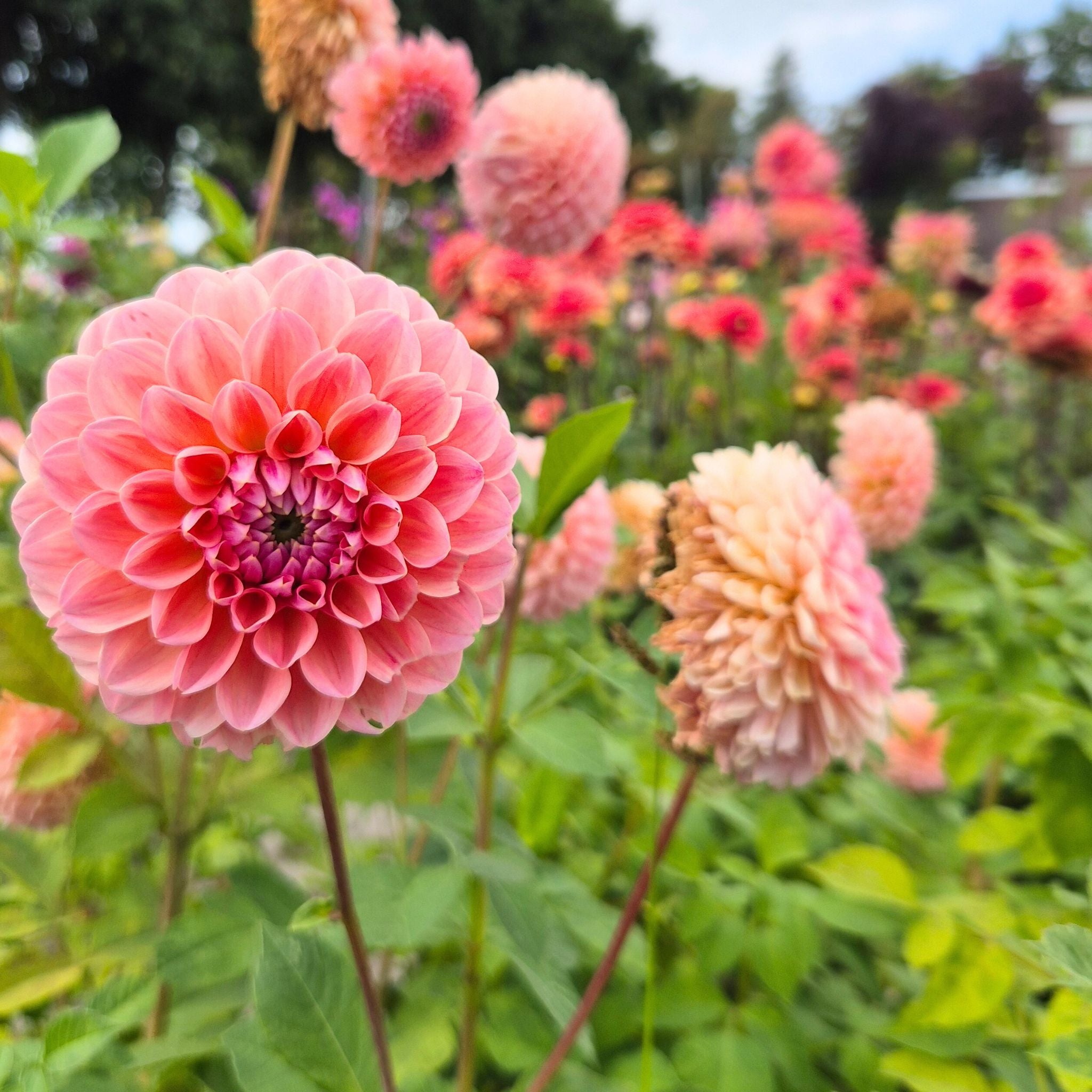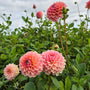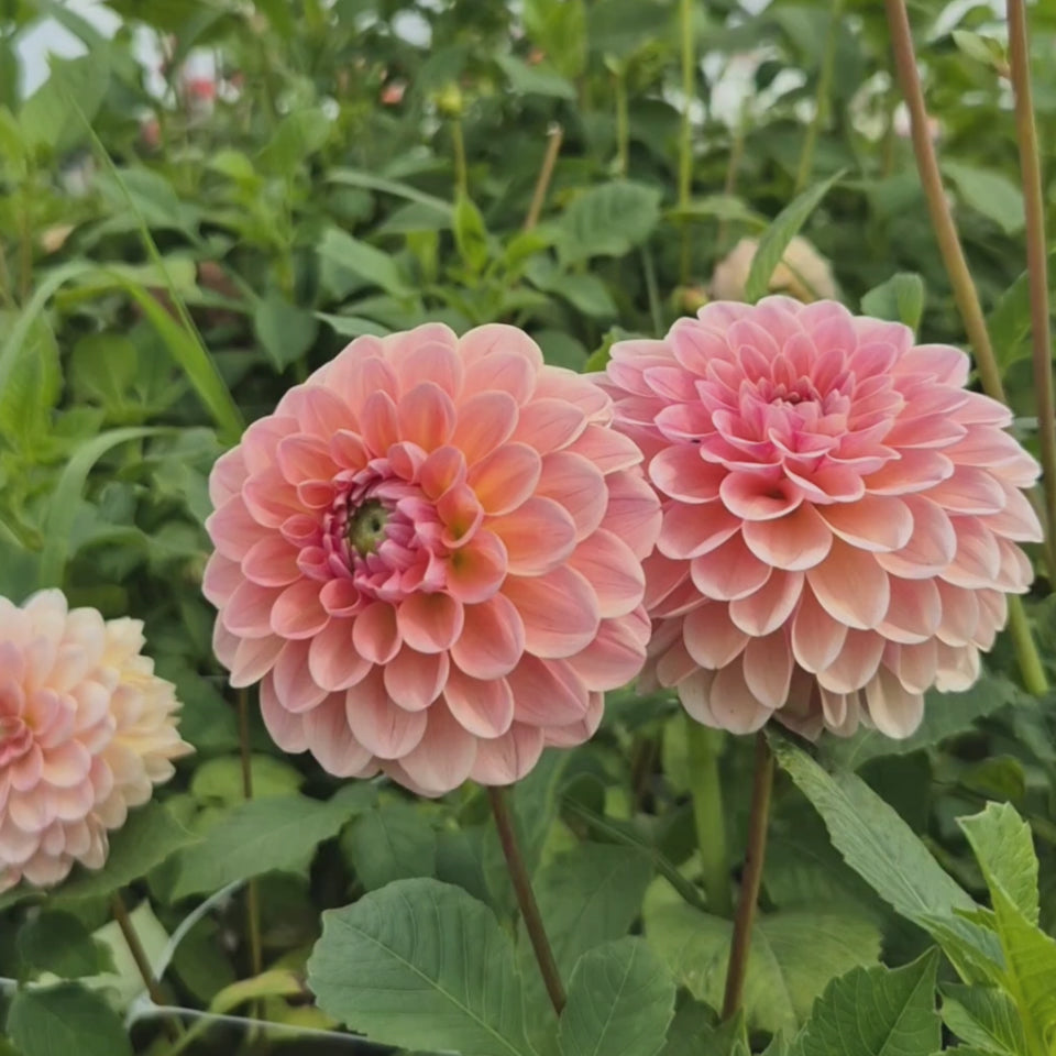 Die Dahlie ‘Nathalie G’ ist eine Sorte, die man sofort ins Herz schließt. Aufgrund ihres kleinen, aber feinen Aussehens wird sie auch als Miniatur- Balldahlie bezeichnet. Die Blüten haben einen Durchmesser von 8 cm und lassen sich daher sehr gut mit anderen, größeren Dahliensorten kombinieren, wodurch ein luftiger und verspielter Effekt entsteht. Die runden Blüten haben eine zarte pfirsichrosa Farbe mit einem warmen Lachston und einem Hauch von Gelb an der Basis der Blütenblätter.