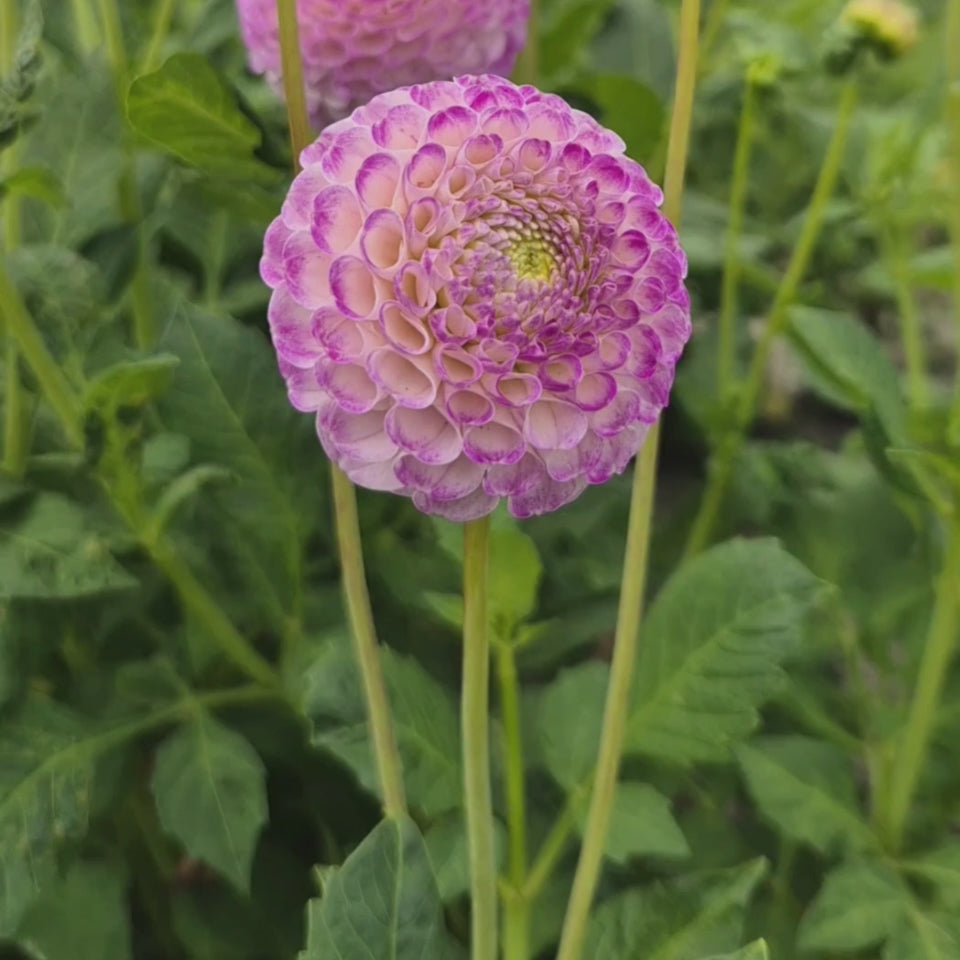 Die Dahlie ‘Ping Pong’ ist eine Pompon-Dahlie mit etwa 5 cm großen Blüten, die perfekt kugelförmig sind und auf langen Stielen stehen. Das macht sie zur perfekten Schnittblume für deinen Sommerstrauß und verleiht deinem Garten in Kombination mit den oft großen Dahlienblüten einen schönen, verspielten Effekt.