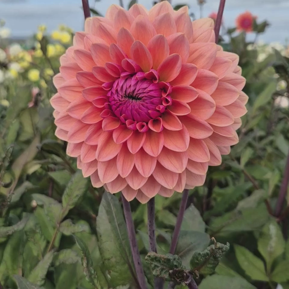 Die Dahlie ‘Sweet Sanne’ verändert während der Blüte ihre Farbe, und das finde ich toll! Die Blüte ist zu Beginn zart gefärbt in Apricot und Pfirsich mit einem schönen, pflaumenfarbenen Schimmer. Mit zunehmendem Alter verblasst die pflaumenfarbene Nuance und geht in einen leichten Lilaton über.