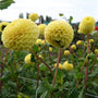 Dahlia 'Buttercup' is a soft, yellow-vanilla pompom dahlia. Its delicate flowers, about 5cm wide, create a playful look in a romantic, soft color palette. Its bright yellow, perfectly round pompom flowers resemble tiny glowing orbs of light dancing above the dark green foliage.