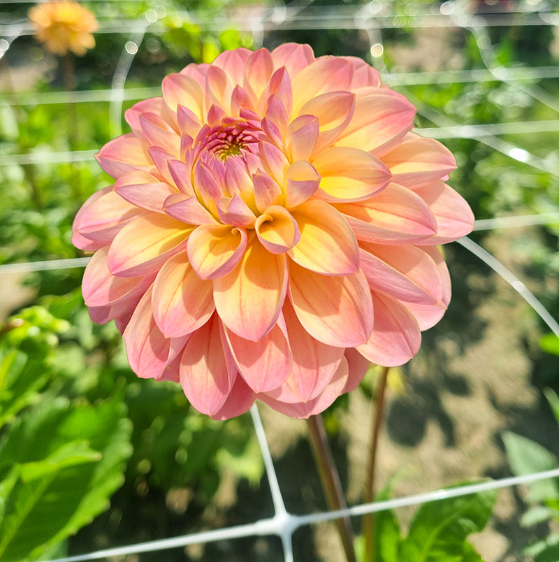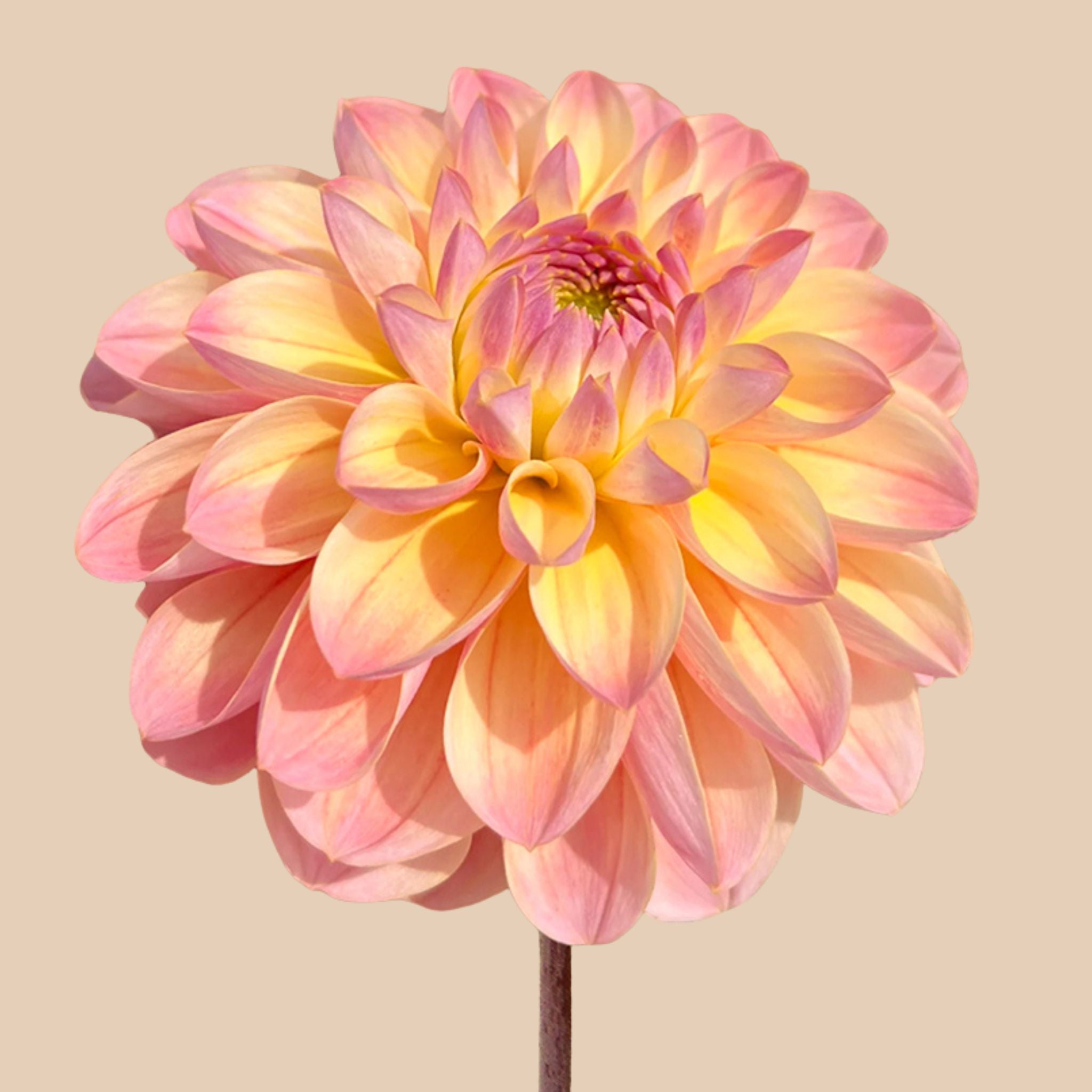 Dahlia 'Hapet Pastel' is a ball-shaped dahlia with delicate, soft pastel shades. Its flowers are round and compact, about 12 cm in diameter, held high on sturdy, long stems. The soft color palette of peachy pink and soft buttery yellow gives it a dreamy look and makes it a lovely base for combining with other pastel-colored dahlias.