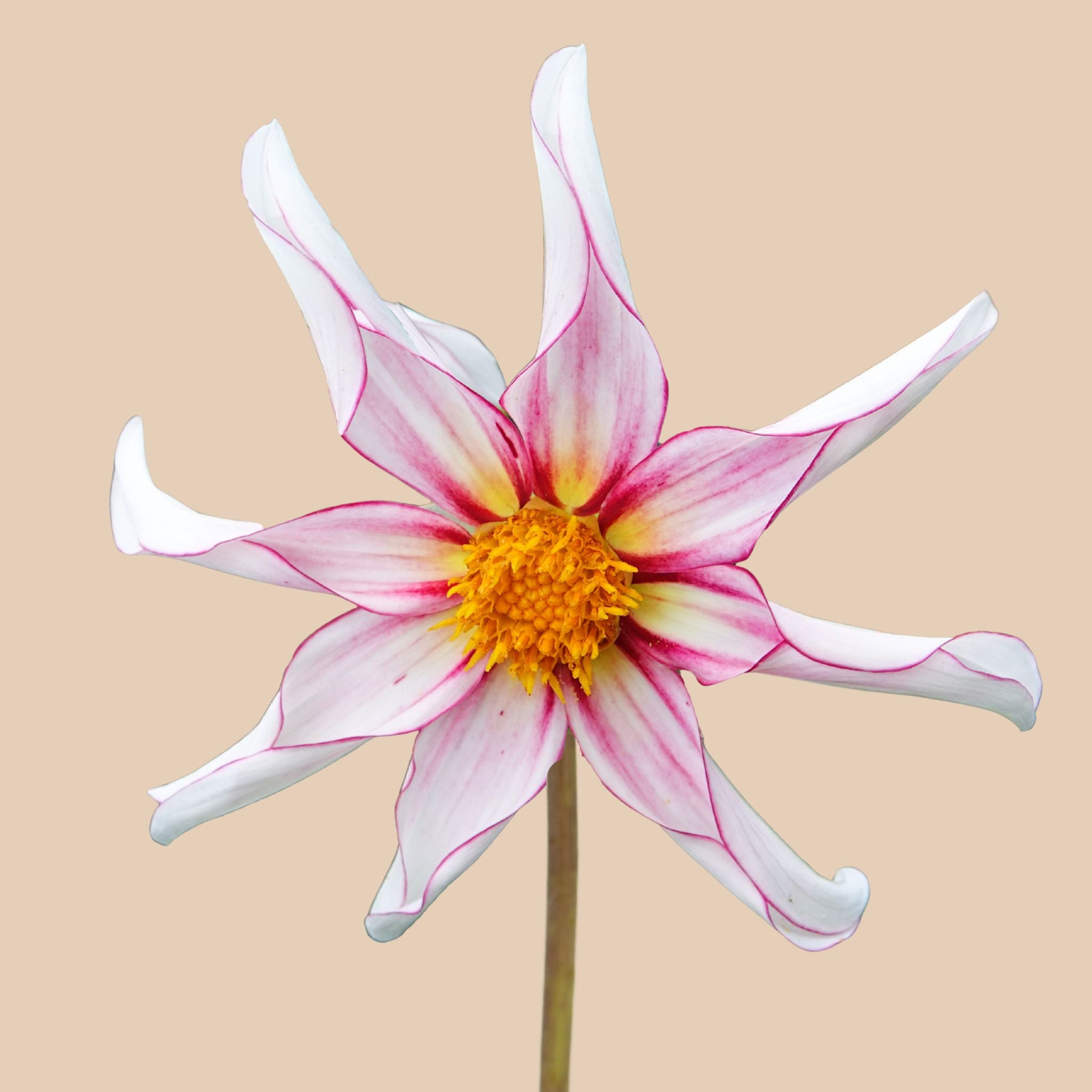 Dahlia 'Honka Fragile' is one of my favorite dahlias; it shines like a star in your garden. Its subtle and simple design makes it so beautiful. Its narrow white petals are gently folded and edged with a soft pink. At its heart, a golden yellow bloom bursts with nectar, attracting a buzz of bumblebees and honeybees. A valuable and elegant addition to your garden.