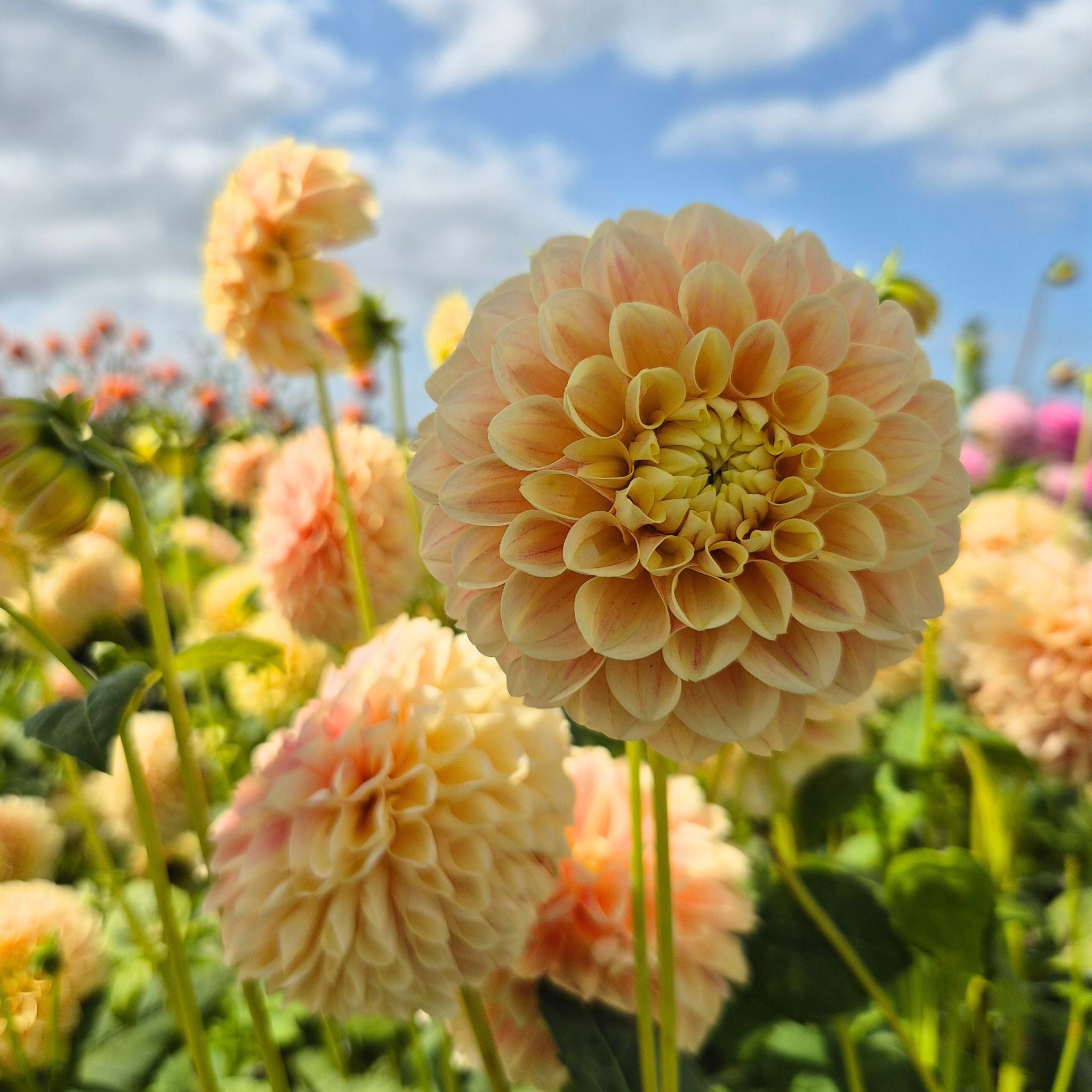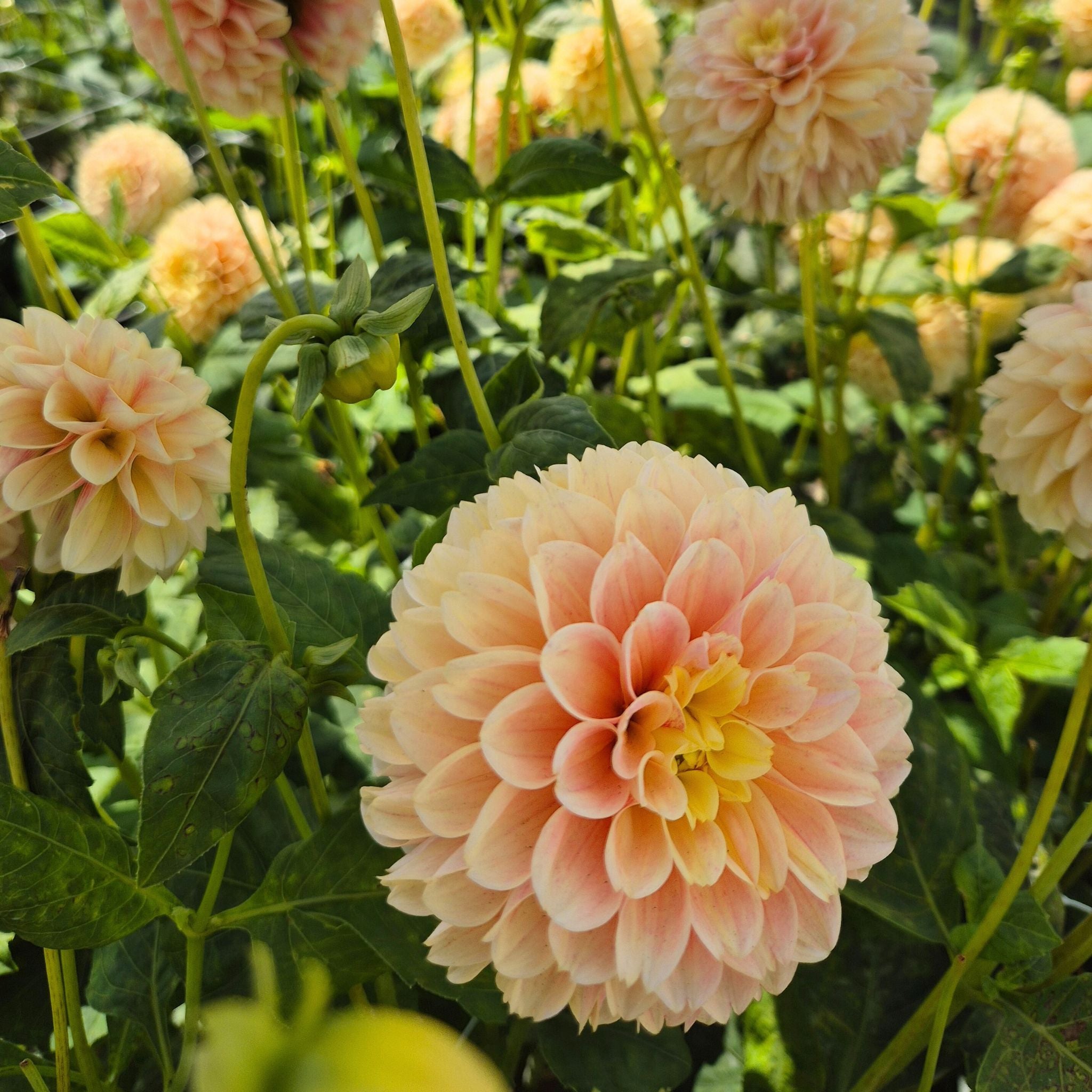 Dahlia 'Sweet Suzanne' boasts a beautiful, warm, summery color palette. Its rounded petals have a soft peach-cream hue, fading to a creamy yellow toward the center. The subtle interplay of colors combined with the lovely round, pom-pom-shaped flowers makes it a lovely addition and a perfect base for combining with other pastel-colored dahlias.