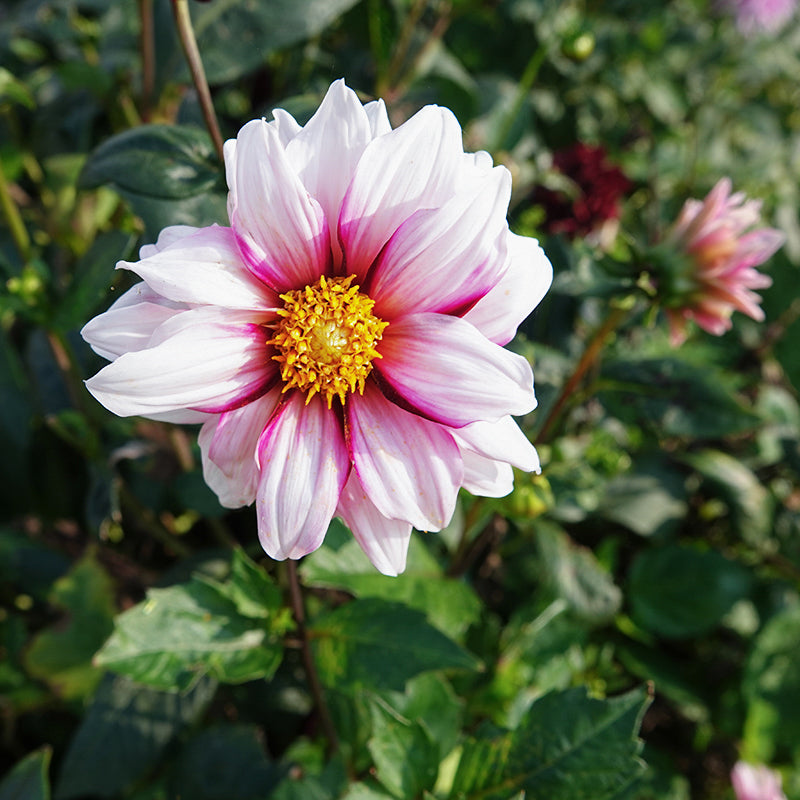 Dahlia ‘Edge of Joy’ is een bloem die letterlijk leven terugbrengt in je tuin. Haar bijna witte bloemblaadjes hebben een zachtroze waas en zijn langs de randen afgewerkt met een opvallende donkerpaars-roze rand. In het midden straalt een zonnig geel hart, vol met nectar, waardoor het een magneet is voor bijen en vlinders.