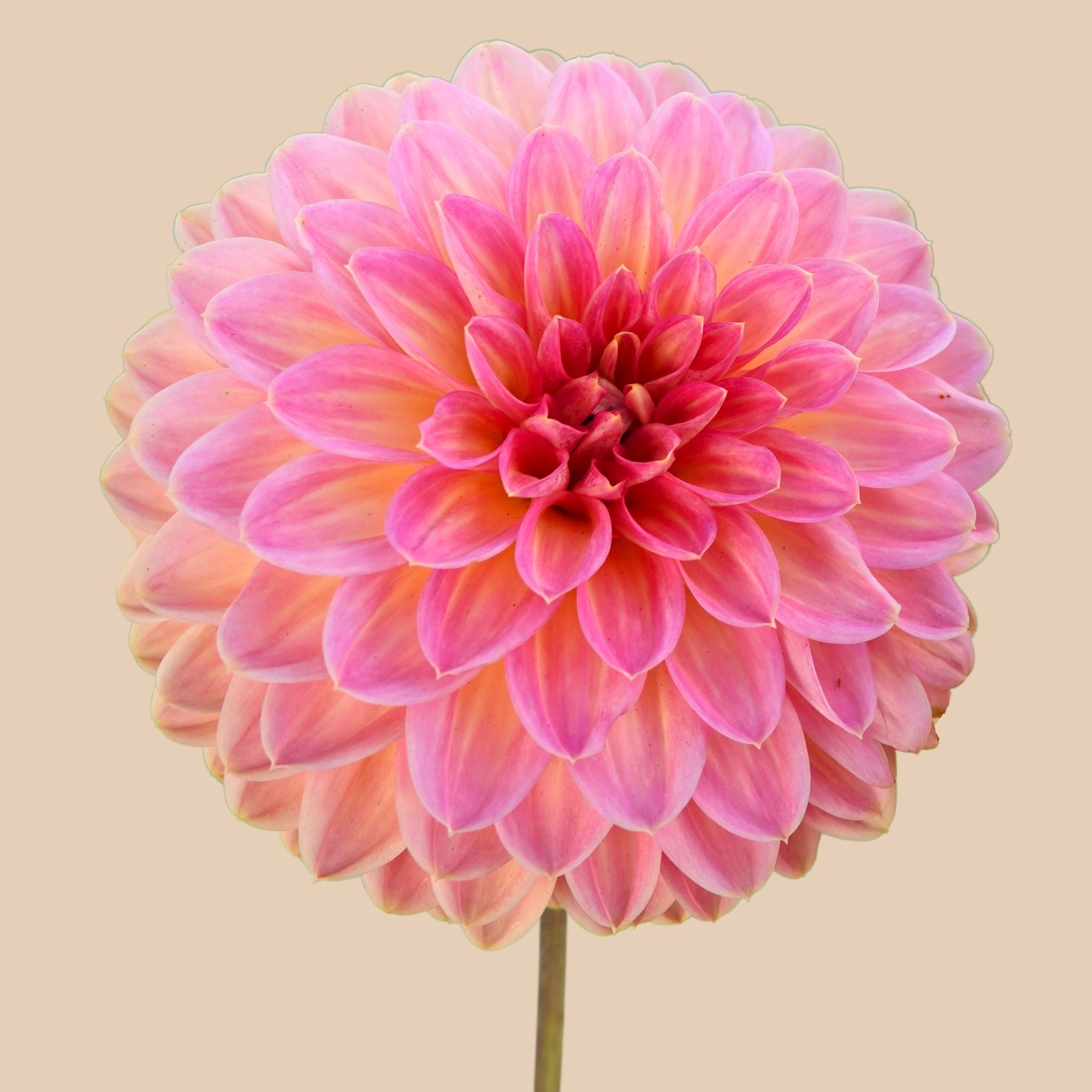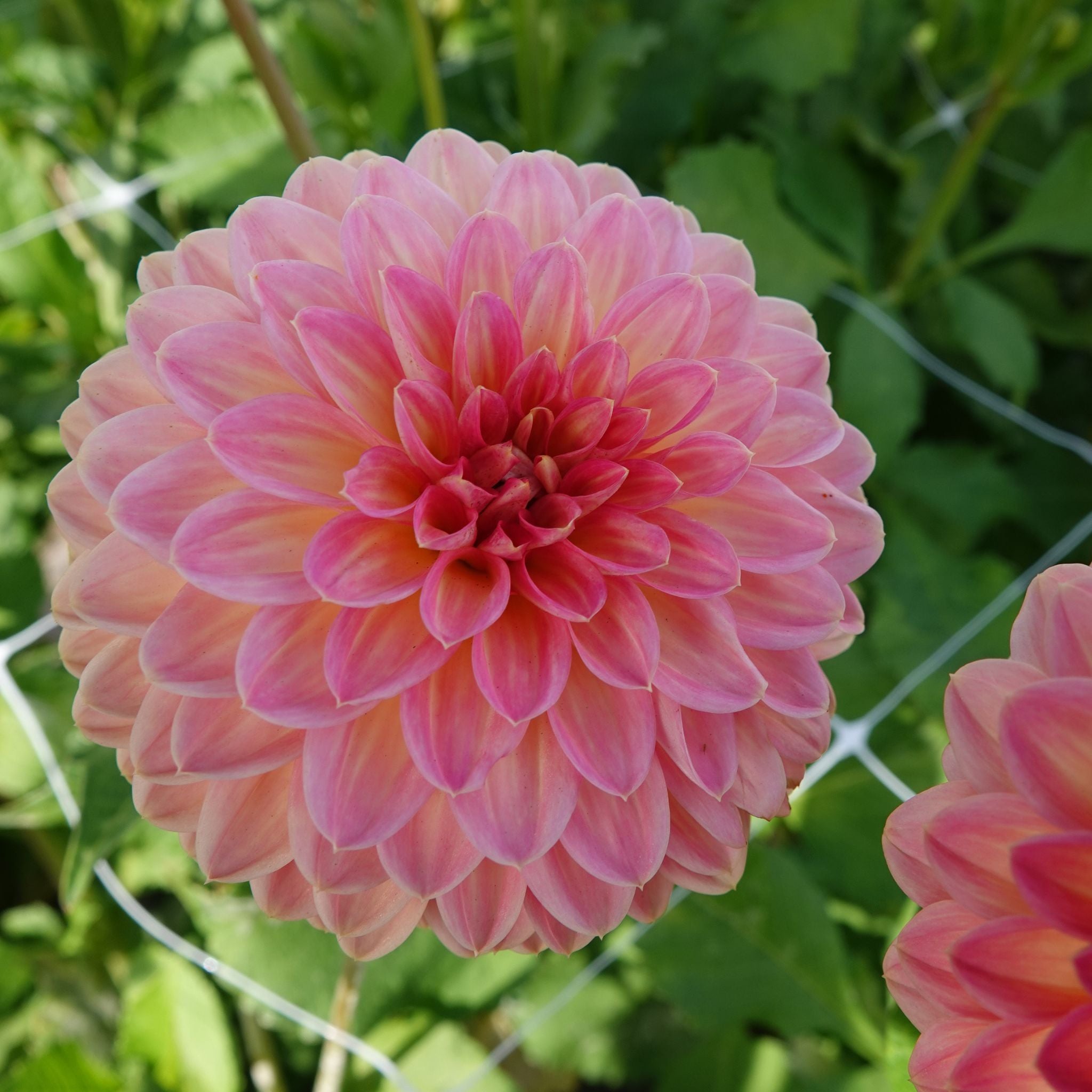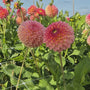 Dahlia ‘Hillcrest Suffusion’ heeft een kleur die je niet onder één kleuromschrijving kan vangen. Haar balvormige bloemen zijn gekleurd in een mix van mango, koraal en perzik tinten, met een helder geel hart. Soms neigt ze wat meer naar roze, waardoor je de hele zomer weer een andere tint ontdekt. Met een bloemdiameter van zo’n 12 cm en een hoogte van ongeveer 100 cm past ze perfect middenin de border, maar ook in een grote pot doet ze het goed.