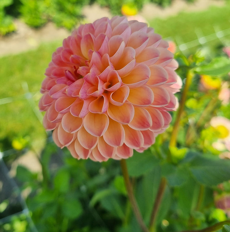 Dahlia ‘L.A.T.E.’ is een kleine baldahlia (of een grote pompon, net welke naam je het wil geven) die je tuin meteen een warme gloed geeft. Haar bloemen zijn perfect rond en opgebouwd uit strakke opgerolde bloemblaadjes. De kleur begint fris en fel in perzik en roze, maar wordt zachter naarmate de bloem ouder wordt. Met een vleugje framboos en soms een hintje geel lijkt elke bloem net een andere versie. Juist die variatie maakt haar zo leuk en verrassend.