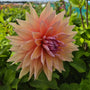 Dahlia ‘Mango Madness’ heeft ernorme bloemen van zo’n 25cm en een magisch kleurenpalet die bij geen enkele andere dahlia terug te vinden is. Kleuren zijn op beeld soms moeilijk te vangen dus ze lijkt misschien oranje maar dat is ze niet. Hierbij geef ik de werkelijke kleuromschrijving: zacht abrikoos, warme goudtinten en een vleugje roze, met een rokerige gloed. Qua bloemvorm lijkt het op het zusje van de bekende dahlia Café au Lait.