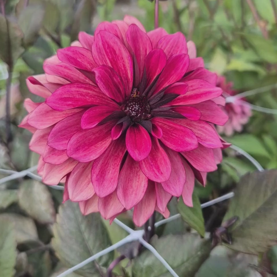 Dahlia ‘Night Silence’ is een mysterieuze verrassing in de tuin, de donkere bladeren en grote bloemknoppen doen mij altijd afvragen wat daar nou weer groeit. Als de bloemen van 12cm doorsnee zich ontpoppen is het magisch kleurenspel van diep mauve en framboosrood met een bijna zwart hart. De donkere, paarsbruine bladeren vormen het perfecte contrast en geven de plant ook buiten de bloei al karakter.