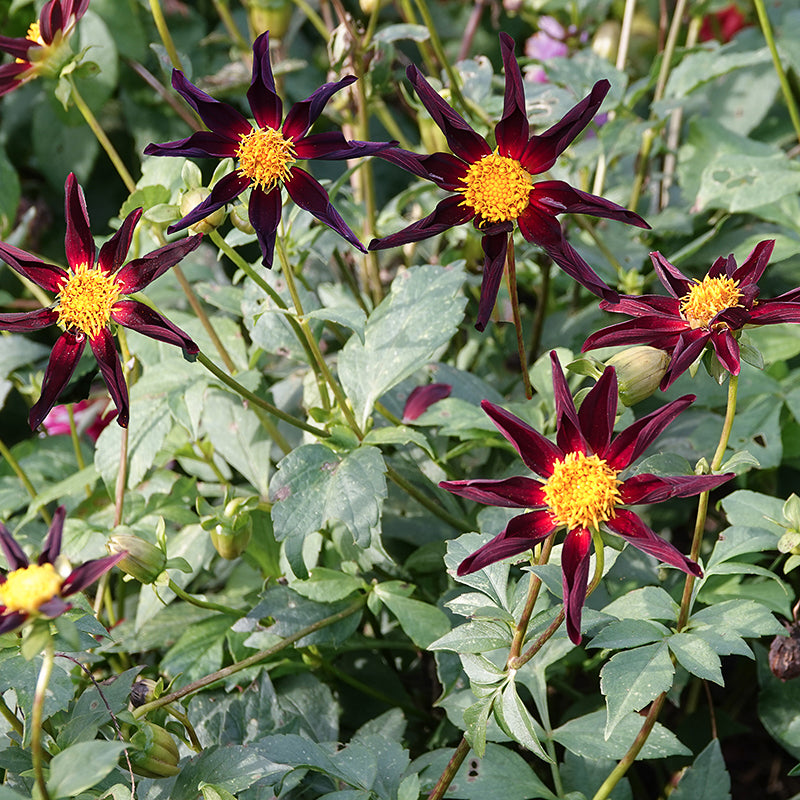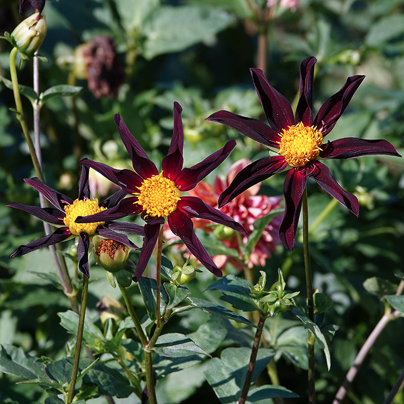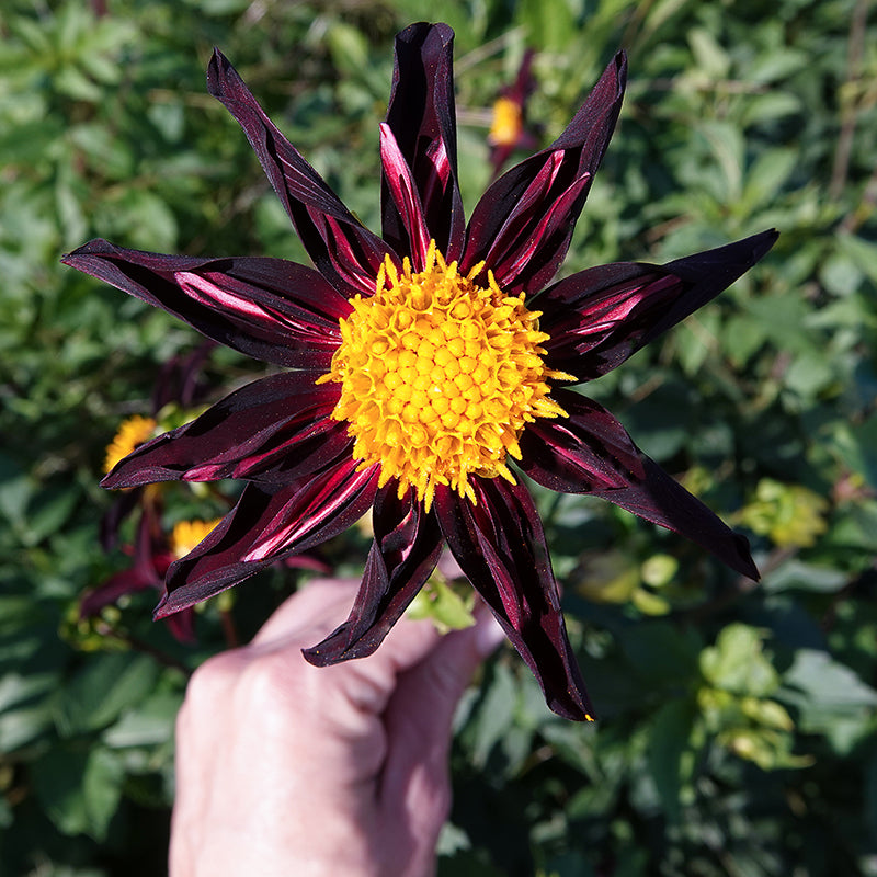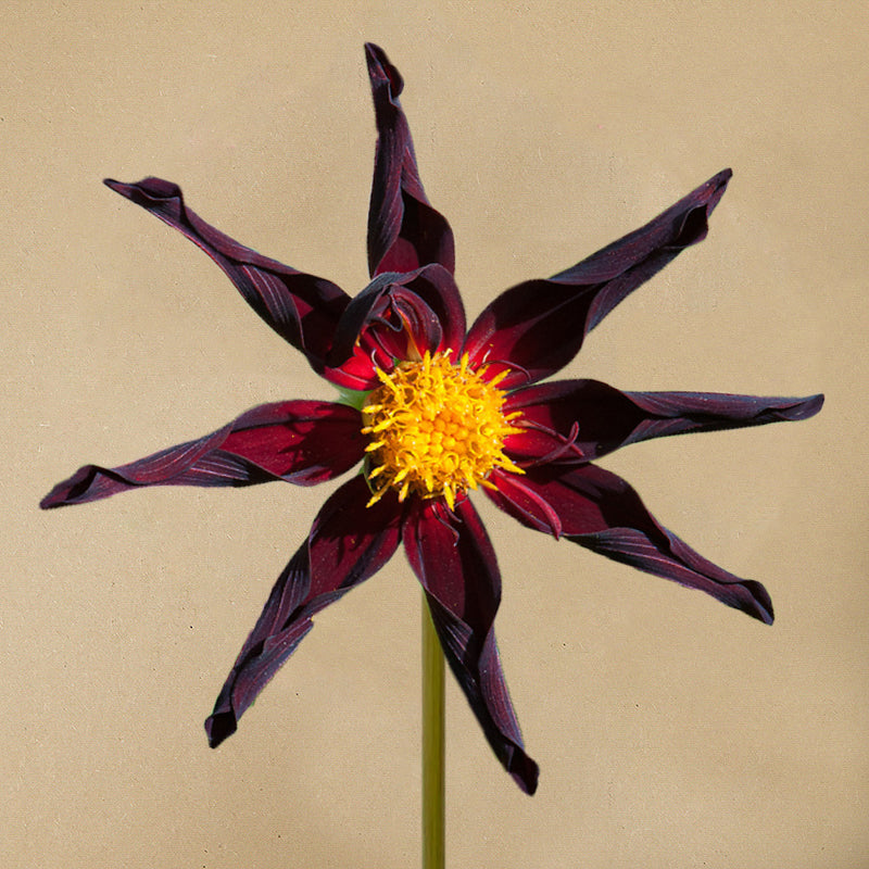 Dahlia ‘Verrone’s Obsidian’ heeft stervormige bloemen ze zijn zo diep donkerrood dat ze bijna zwart lijken. In het midden straalt een felgeel hart vol nectar, een onweerstaanbare uitnodiging voor bijen, hommels en vlinders. Haar bloemblaadjes zijn iets gedraaid waardoor ze een mooie delicate uitstraling heeft. Een klein kunstwerk!