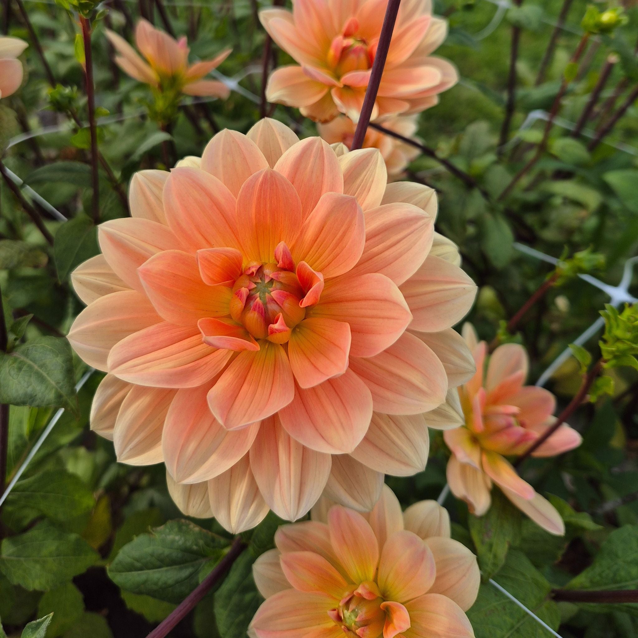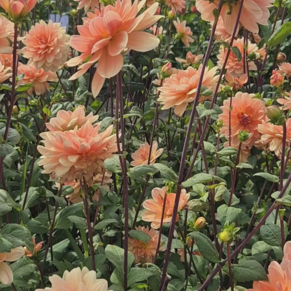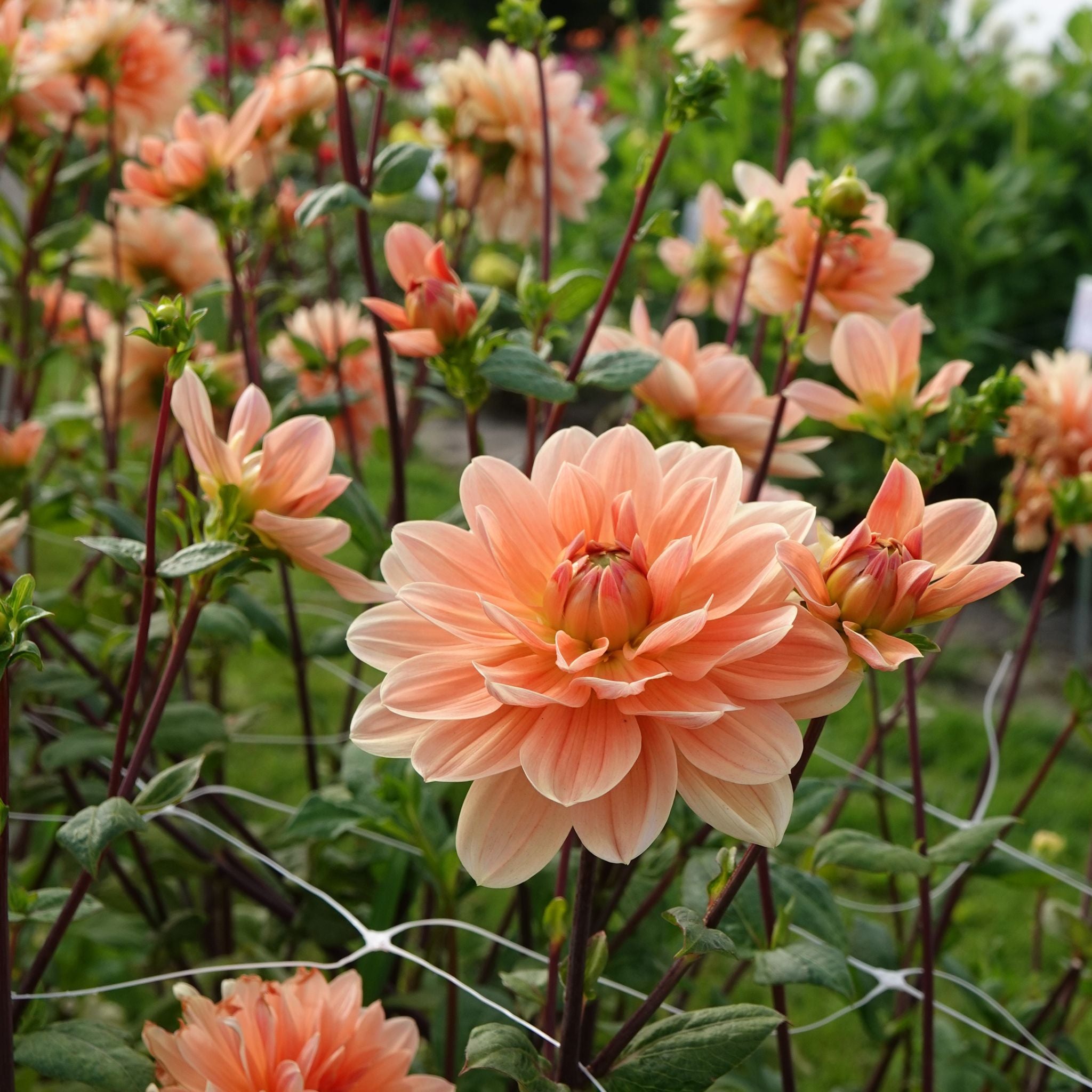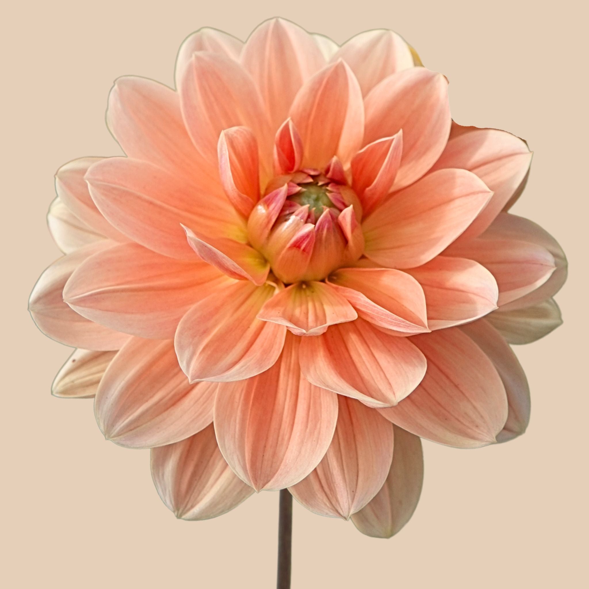 Dahlia ‘Yvonne’ is mijn nieuwe favoriet. Haar bloemen van zo’n 12 cm hebben een warm kleurenpalet die gedurende de bloei overloopt van een warme abrikoos tint naar een zachte zalmkleur. De brede, platte bloemblaadjes geven haar die typische waterlelie vorm waarbij je recht in het hart van de bloem kunt kijken. Door de mooie bloemvorm steken de bloemen boven de bladeren uit dat is wat ik het allermooiste aan haar vind.