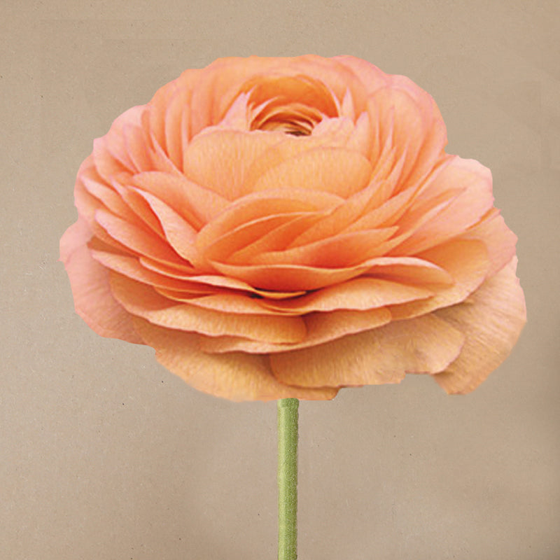 Ranunculus ‘Elegance® Salmone’ oftewel een Italiaanse Ranonkel, in een hele mooie zalmkleur. Rechtstreeks vanuit Italië geïmporteerd om ook de Nederlandse tuinen te sieren met de grote, volle bloemen, die perfect te gebruiken zijn als snijbloem door de hoge, stevige bloemstelen.