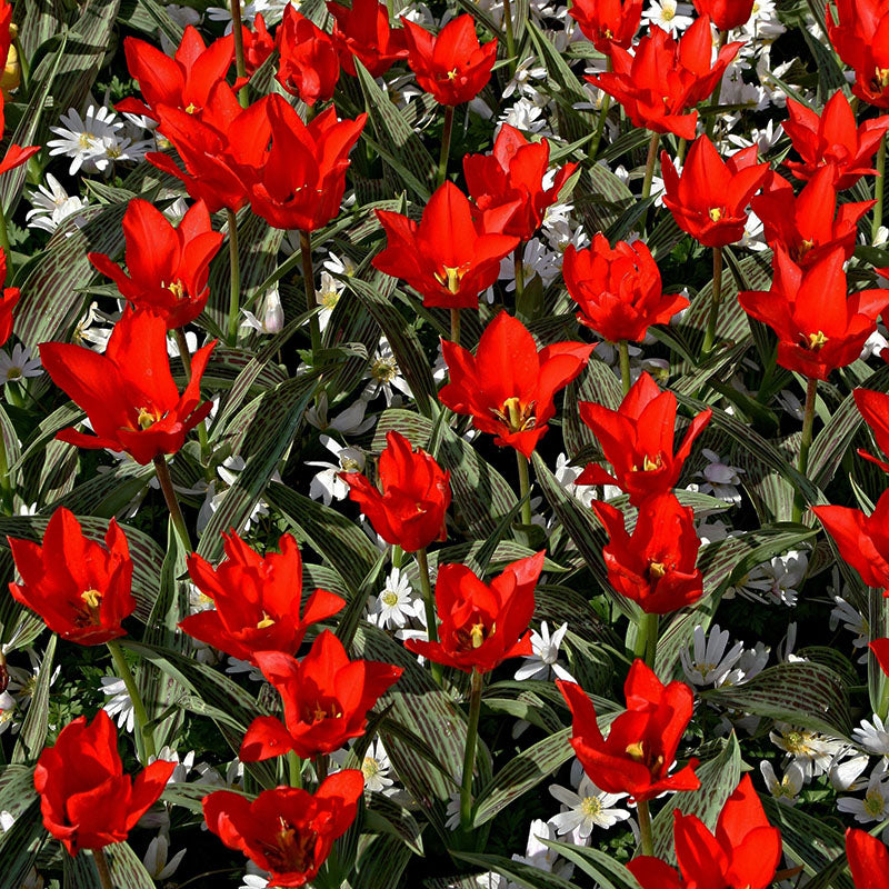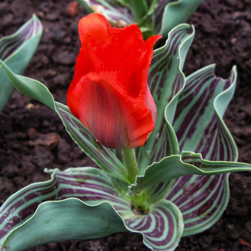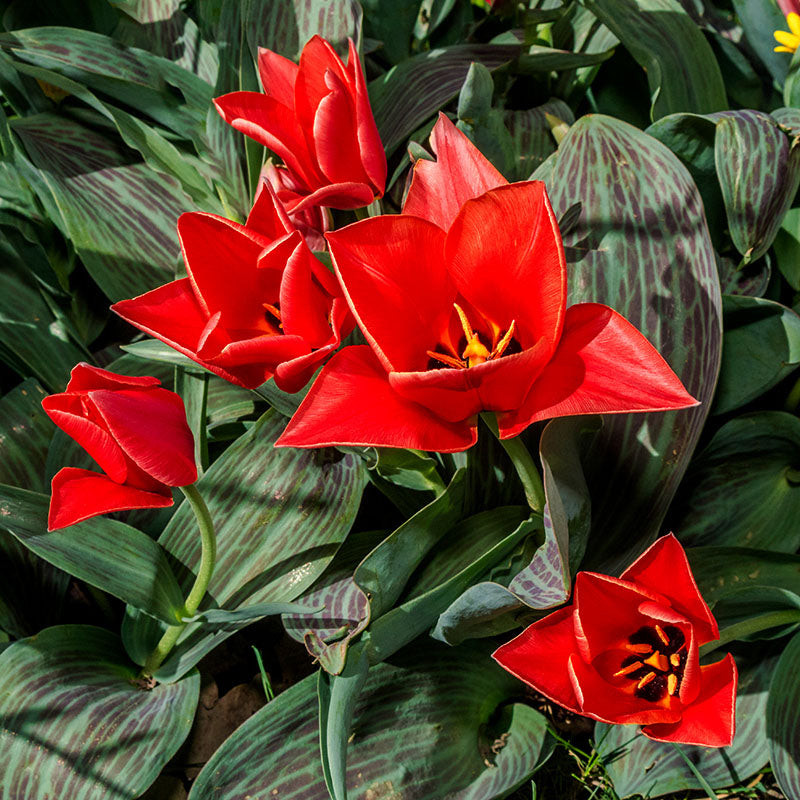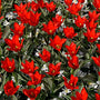 Tulp Red Riding Hood oftewel roodkapje. Zoals te verwachten zijn de bloemen helder rood van kleur, maar kijk ook eens goed naar de mooie tekeningen op het blad. De heldergroene bladeren zijn versierd met donkere bruin paarse tekeningen, prachtig! Vanaf 20 stuks: € 6,50 per verpakking